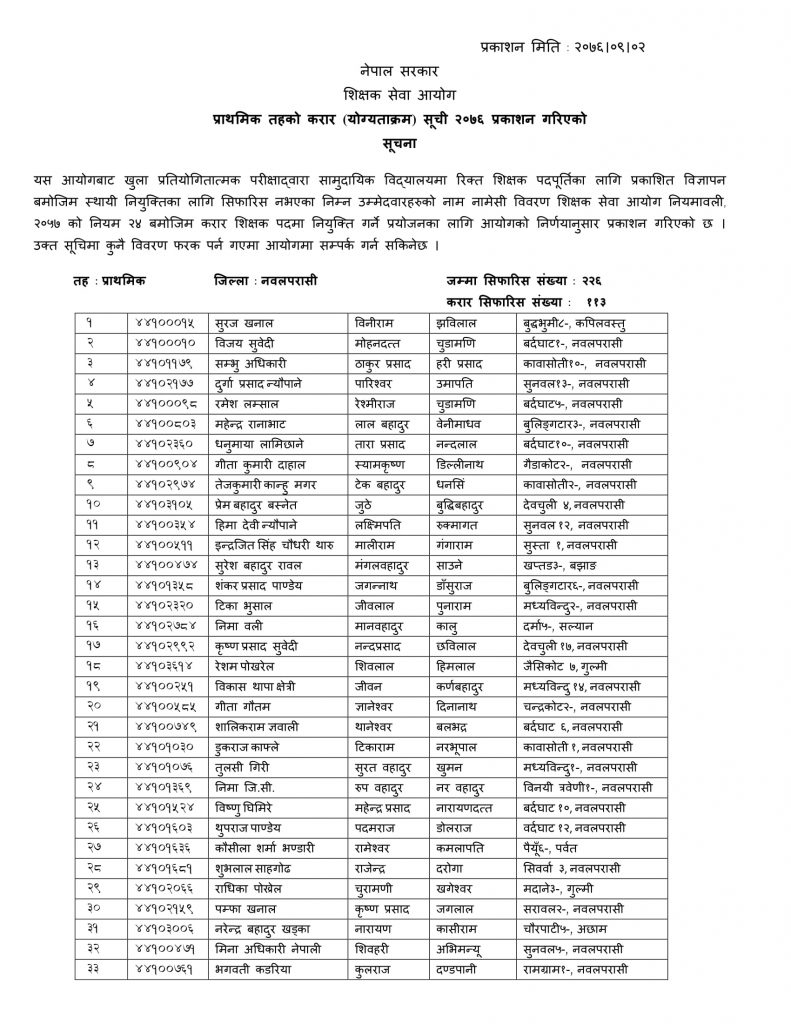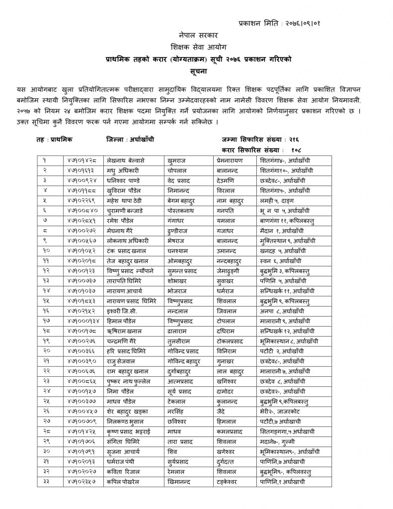 Teacher Service Commission published karar shikshak of primary level. Arghankhanchi and Nawalparasi Primary Level Karar Contract teacher list