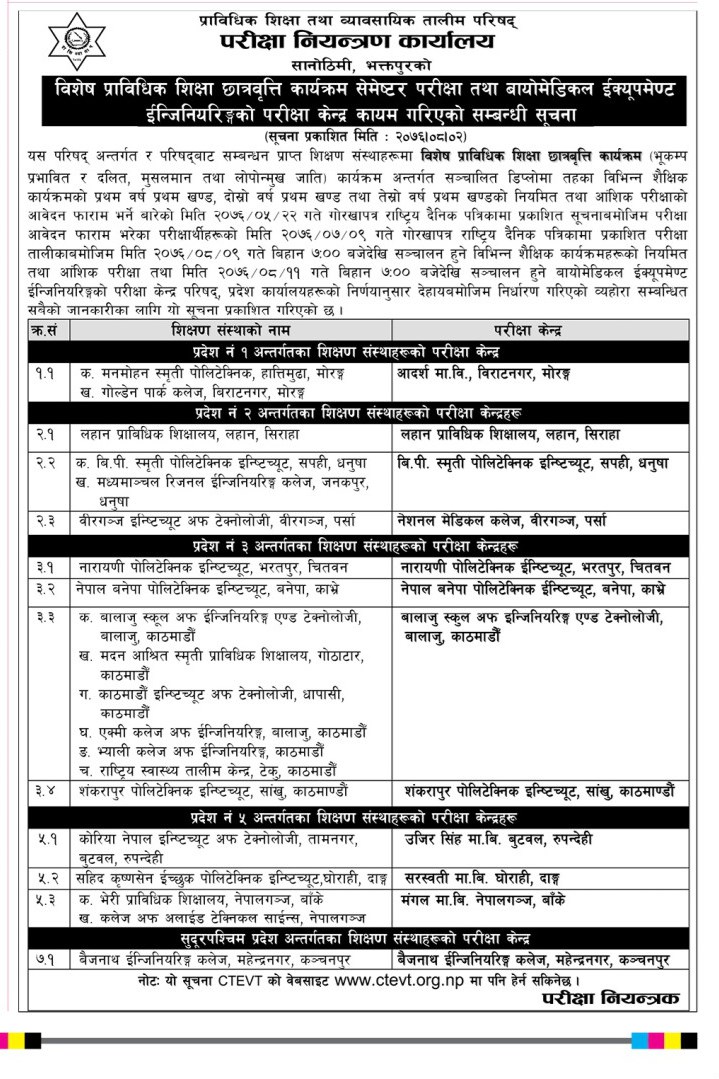 CTEVT Published Exam Center Notice of Special Technical Education Scholarship Program.