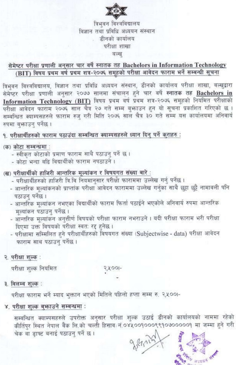 Tribhuwan University published Bachelor in Information Technology ( BIT) First Semester Exam Application Form.