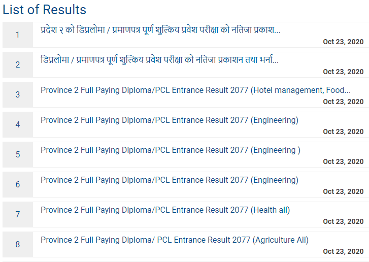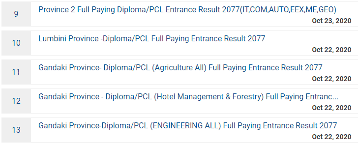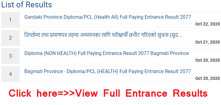 All the Diploma Level program entrance exam results of all province Pradesh and PCL certificate level program entrance exam results of all province are given below.
