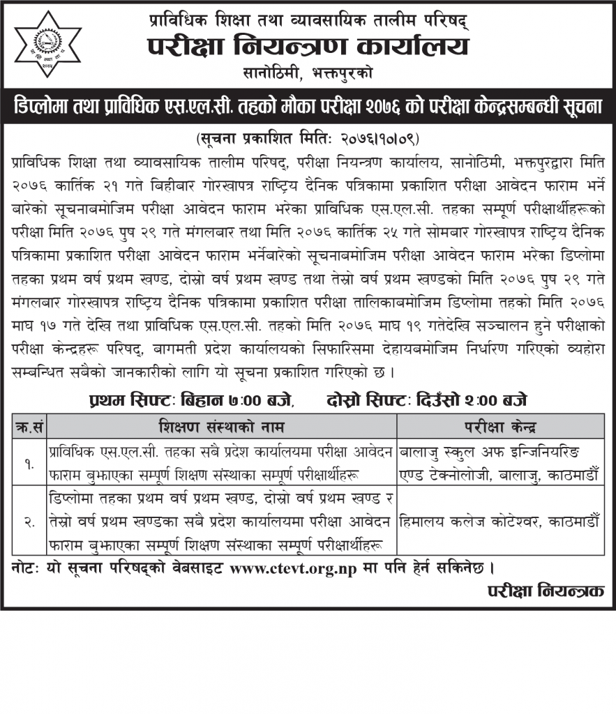 CTEVT Published Exam Center Notice for Diploma & TSLC Level Special Chance Exam. All the Exam Center notice are given below.