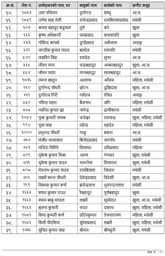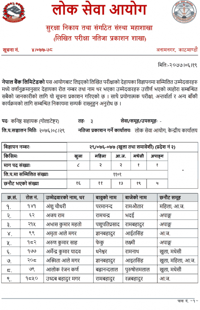 Nepal Bank Limited (NBL) Gold tester written exam results of Pradesh 2 by lok sewa aayog (PSC).