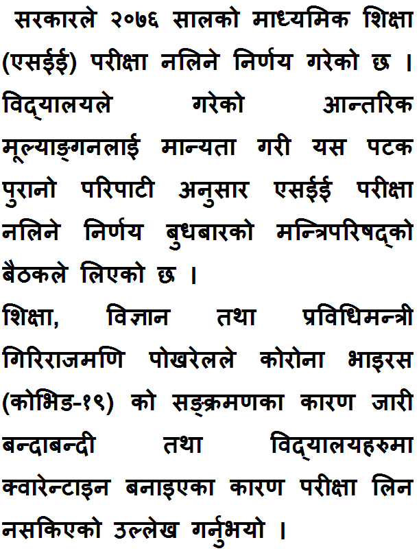 The government has decided not to take the Secondary Education (SEE) examination of 2076 BS. Recognizing the internal evaluation done by the school, the cabinet meeting on Wednesday has decided not to conduct the SEE examination this time as per the old practice.