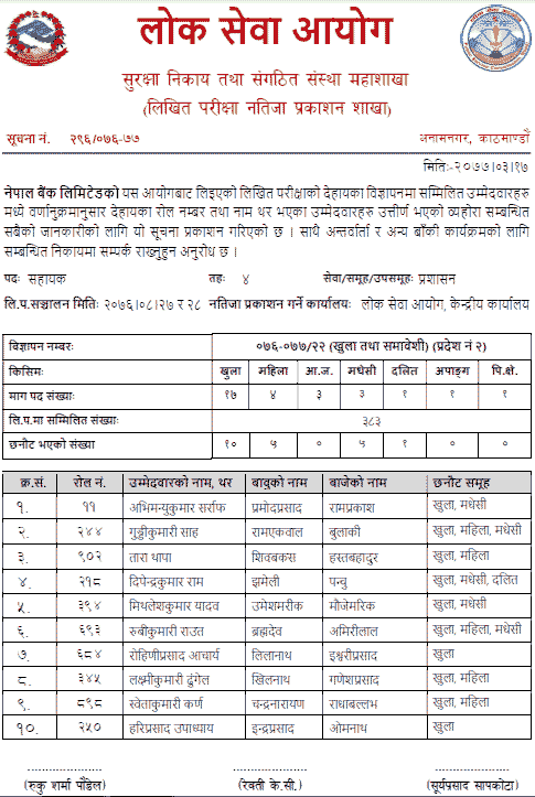 Nepal Bank Limited (NBL) Assistant Level 4th Admin Prasasan written exam result published by Lok Sewa Aayog (PSC). Assistant Level 4th Pradesh No 2 Result of Nepal Bank.