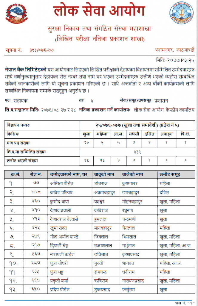 Nepal Bank Limited (NBL) published the vacancy written results of Assistant 4th Level Administration of Pradesh no 5. Nepal bank limited service exam result.
