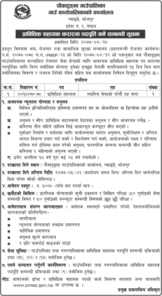 As per the letter dated 2077/078 Ch.No./PMEP/23 dated 2077/04/12, the interested Nepali citizens who have reached the following qualifications for the post of Technical Assistant in the contract required for the Employment Service Center should submit the required details and receipt of payment of revenue within 15 days.