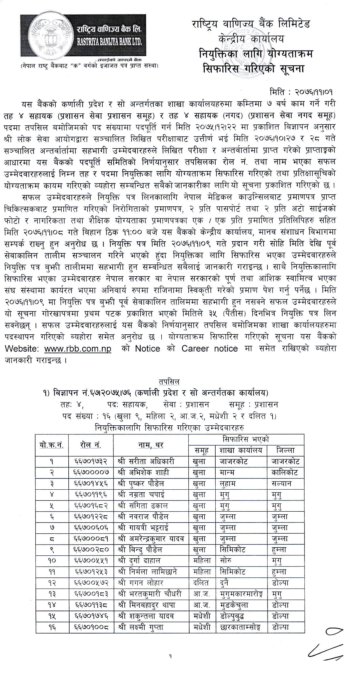 All the selected candidates are requested to contact at Rastriya banijya Bank for appointment process.