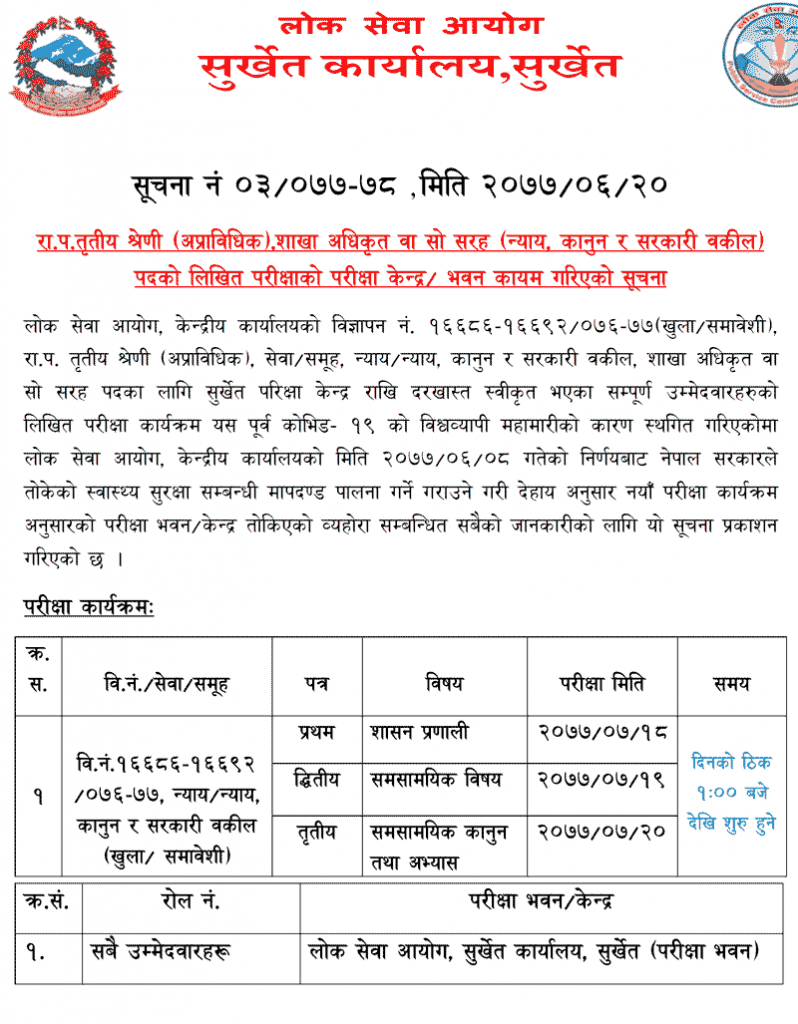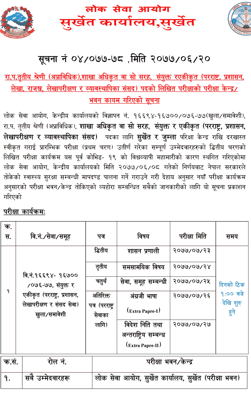 Lok Sewa Aayog recently published the exam center details of Section Officer ( Sakha Adhikrit) Level. All the Administration, Foreign Affairs, Rajaswo, Parliament, Account & Law Justice Groups- Section Officer ( Sakha Adhikrit) exam centers for Surkhet & Jumla was published.