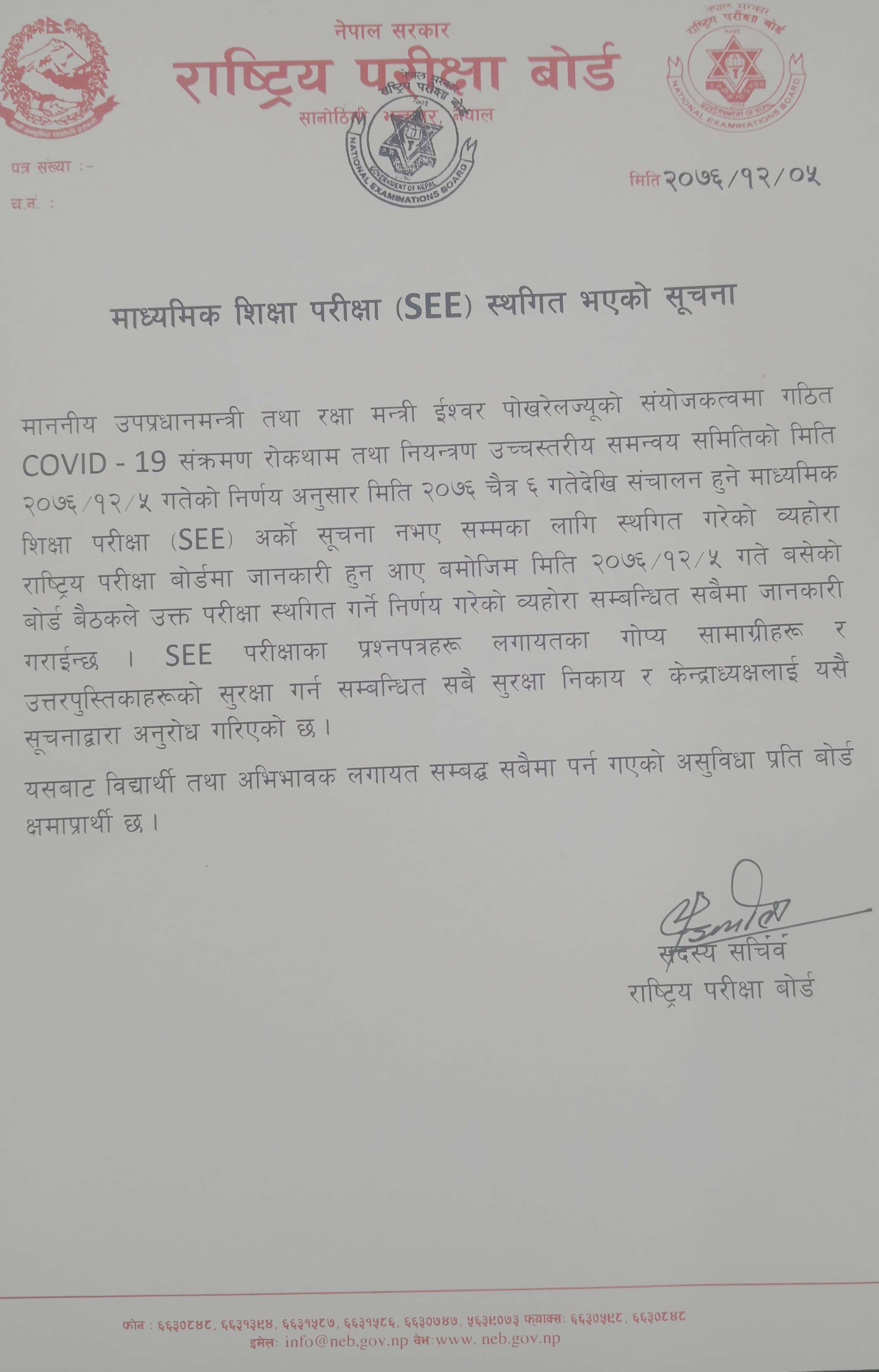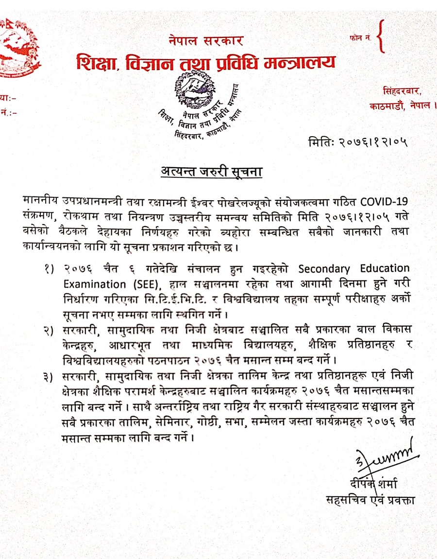 Government of Nepal, Ministry of Education postpones all the exams of SEE, CTEVT, TU & Other University.