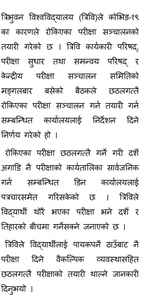 Tribhuvan University (TU) is preparing to conduct the examinations which were stopped due to Covid-19. A meeting of the TU Executive Council, Examination Reform and Coordination Council and the Central Examination Steering Committee on Tuesday decided to direct the concerned office to prepare for conducting the postponed examinations immediately after the Chhat festival.
