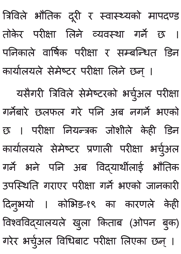 Tribhuwan University will arrange for examinations based on physical distance and health criteria. TU Pariksha niyantran karayalaya will take the annual examination and the semester examination will be conducted by the concerned dean’s office.