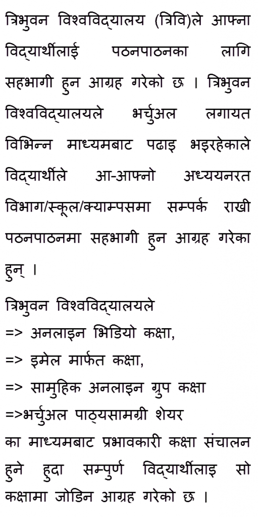 Tribhuvan University has requested all the students to join the class as effective classes will be conducted through online video classes, classes through email, group online group classes and virtual text sharing.