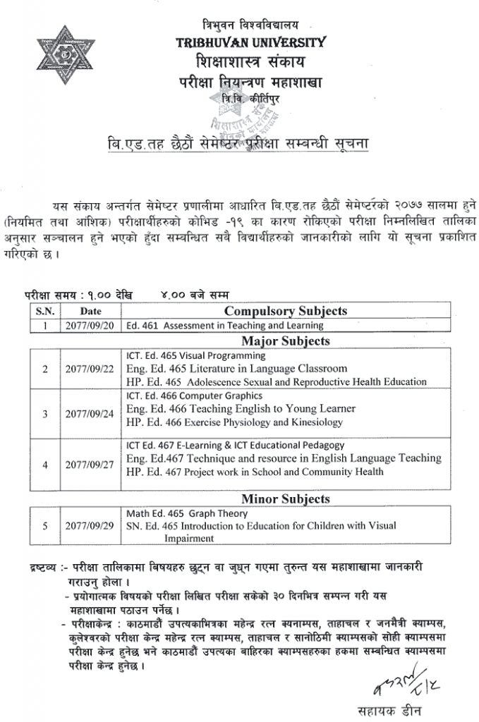 Under this faculty, the examination of the second semester (M.Ed. 2nd Semester) based on the semester system will be held from 30th Mangsir, 2077, undergraduate level Information and Communication Technology and Special. First in the subject of Necessity Education (B.Ed. ICTE & SNE) From the 17th of Poush 2077 of the semester and of the sixth semester Everyone concerned is informed that the operation will start from the 20th of Poush.