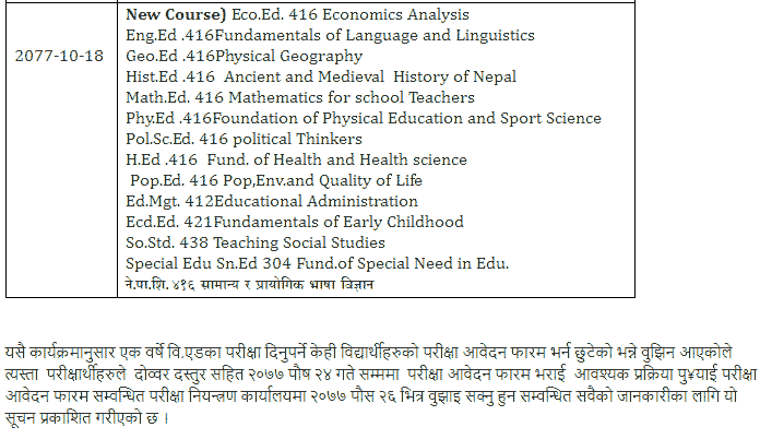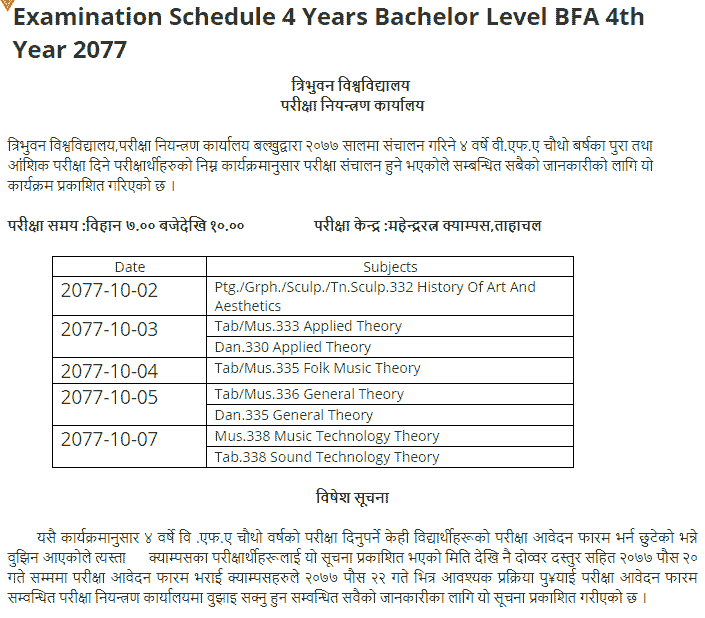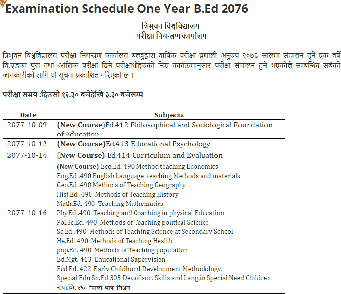 Tribhuwan University (TU) recently published the exam routine and exam center details of various partial subjects and faculty. TU published 1 Year BEd Exam Routine, 4 Years BFA exam Routine. This information has been published by Tribhuvan University, Examination Control Office, Balkhu for the information of all concerned as the annual examination system. All the exam Routine, Exam Center and Exam Time Details are given below.