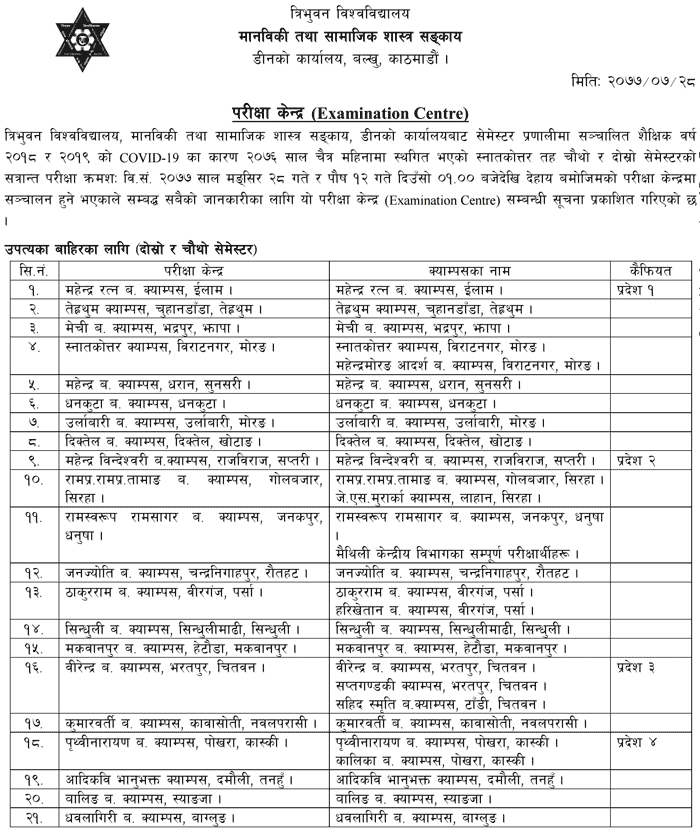 Examination Center The examination of Tribhuvan University, Faculty of Humanities and Social Sciences, Dean’s Office in the semester system has been postponed due to COVID-19 of the academic year 2018 and 2019. Information regarding this examination center has been published for information.