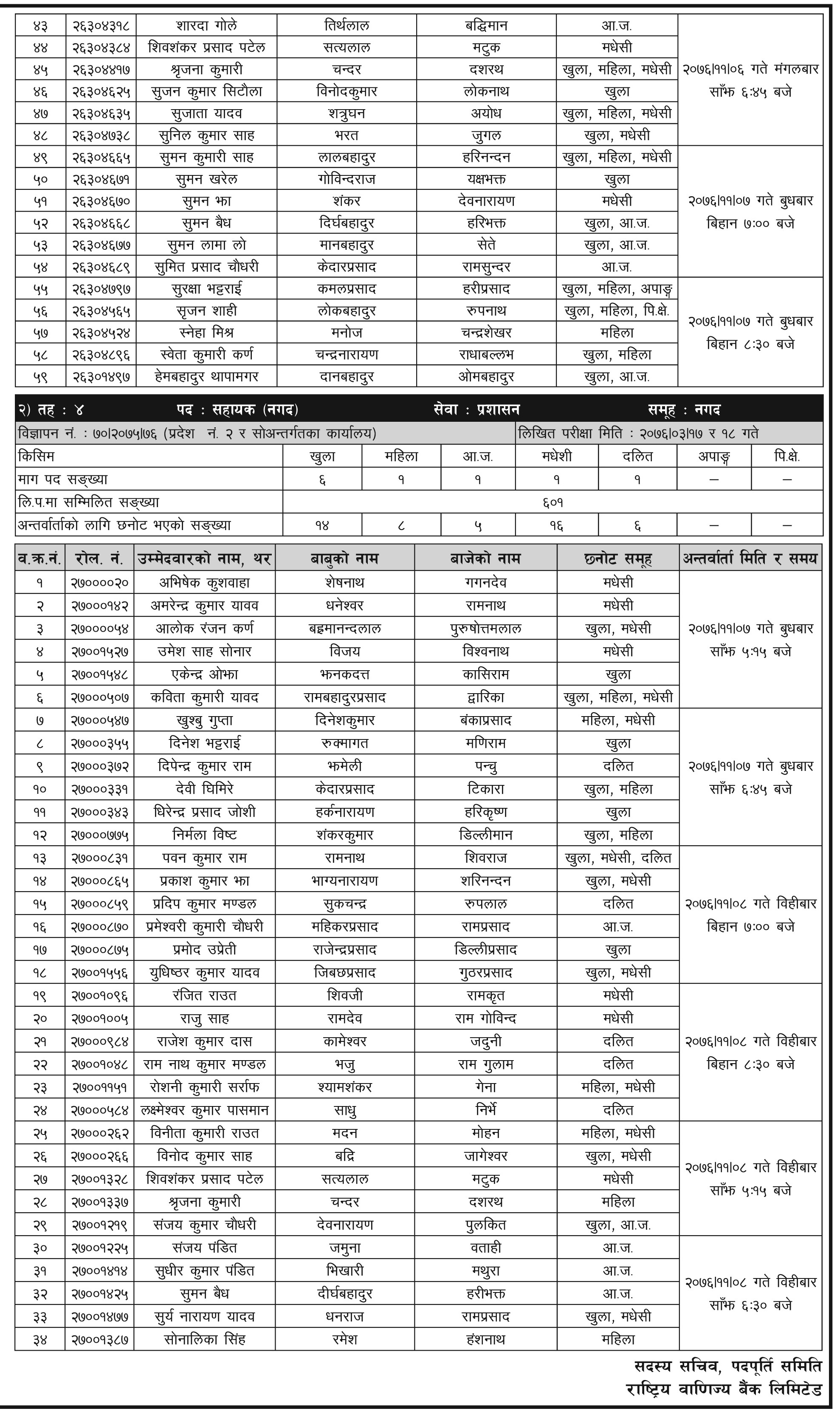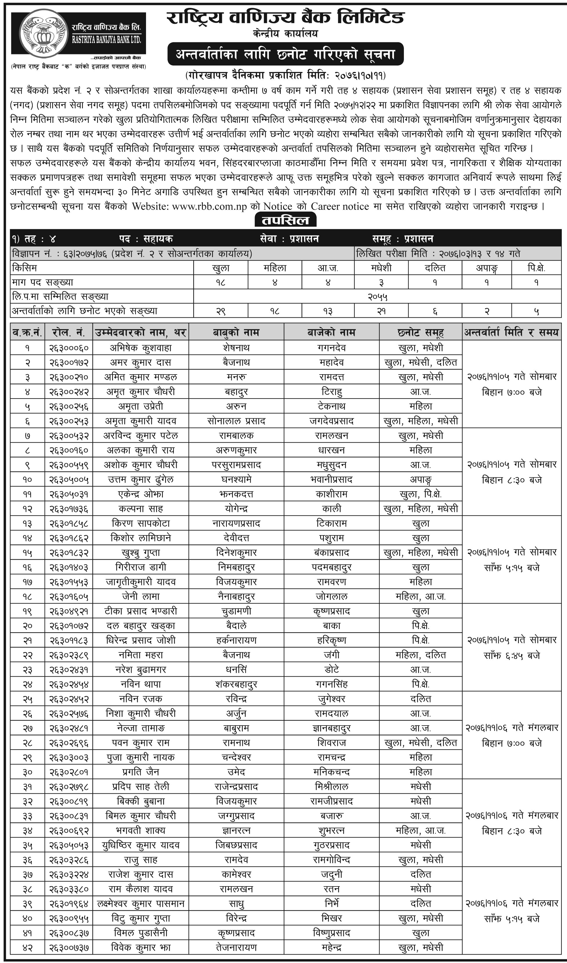 Rastriya Banijya Bank limited published written exam result of administration and cash assistant. All the written exam result and interview notice are given below.