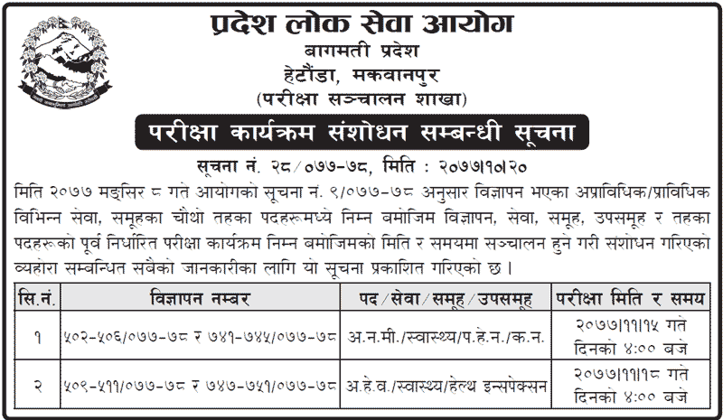 Bagmati Pradesh Lok Sewa aayog published notice regarding exam routine date change or revised of given posts. Exam routine exam date revised by pradesh lok sewa aayog bagmati. All the details of Revised exam routine date are given below.