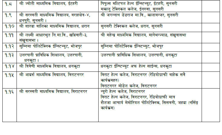Diploma Level & Proficiency Certificate Level PCL Annual Examination of Nursing, General Medicine, Pharmacy, Agriculture, Forestry, Medical Lab Technology, Radiography, Ophthalmic Science, Dental Science (Dental Hygiene), Ayurveda, Homeopathy, Acupuncture, Acupressure and Moxibustion (AAM) and Physiotherapy programs exam center. The Center for Regular and Partial Examinations for the first, second and third years are given below.