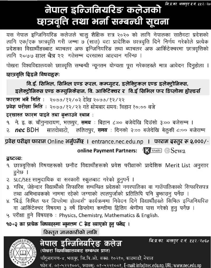 Nepal Engineering College open scholarship application for various engineering studies. Information regarding scholarship and admission of Nepal Engineering College. Nepal Engineering College has decided to give a total of 7 (seven) provincial scholarships for the current academic session 2020 for each of the seven provinces of Nepal.