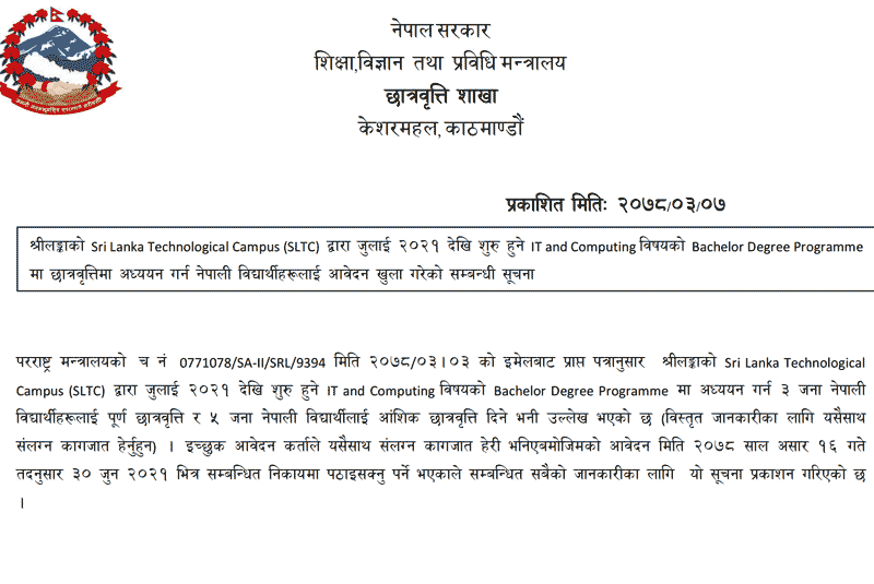 The Embassy of the Democratic Socialist Republic of Sri Lanka presents its compliments to the Ministry of Foreign Affairs and has the honour to inform that Sri Lanka Technological Campus (SLTC) in Padukka, Sri Lanka is offering 03 full scholarships and 5 semi-scholarships for Nepali students who wish to follow bachelor’s degrees in IT & Computing, for the July 2021 intake.