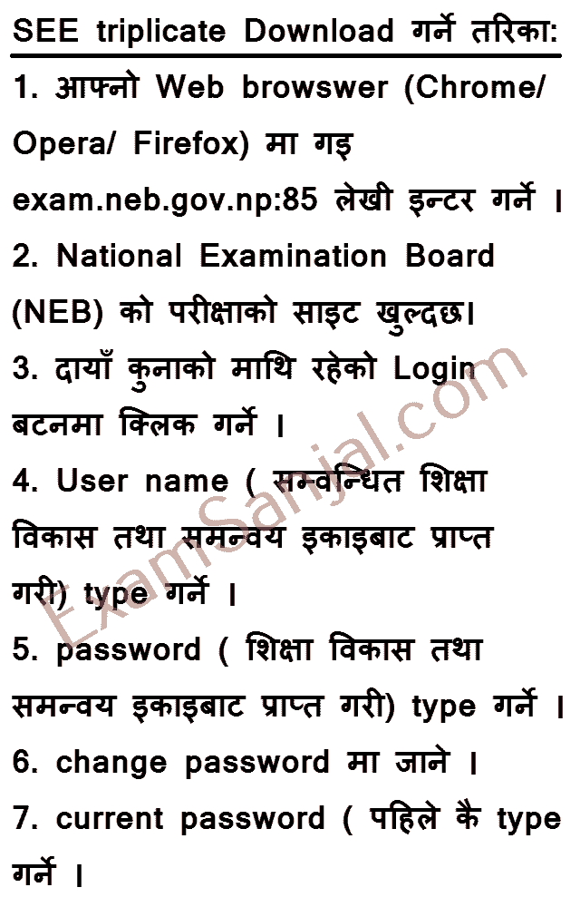 To Prepare the SEE Class 10 examination result, Rastriya Pariksha Board (National examination Board) NEB provides some triplicate form soft copy Excel file with symbol number, name & subject details. All the SEE result triplicate form file download processes are given below. SEE triplicate excel file download process & process to get NEB SEE exam User id Password details for all schools.