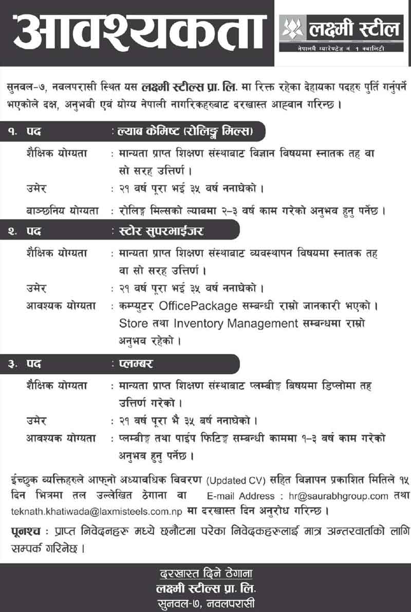 Laxmi Group Laxmi Steels Company published job vacancy notice in various posts and levels. Store Supervisor, Lab Chemist, and plumber job vacancy notice published by Laxmi group steels company.