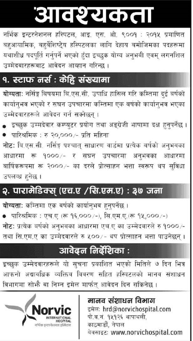 Application Guide: Interested candidates can apply directly to the Human Resources Department of the hospital with their updated personal details within 7 days from the date of publication of this notice or via the following email. Norvic Human Resources Department Email: hrd@norvichospital.com Po.B.No. 15126 Thapathali, Kathmandu.