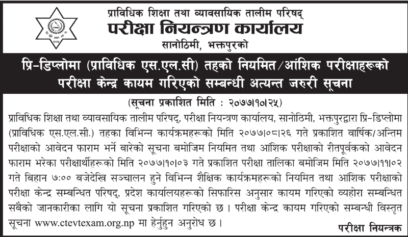 CTEVT published the exam center details of Pre Diploma Level Prabidhik SLC TSLC Regular and Partial Examiners. All the Examination Center Details of TSLC by CTEVT.