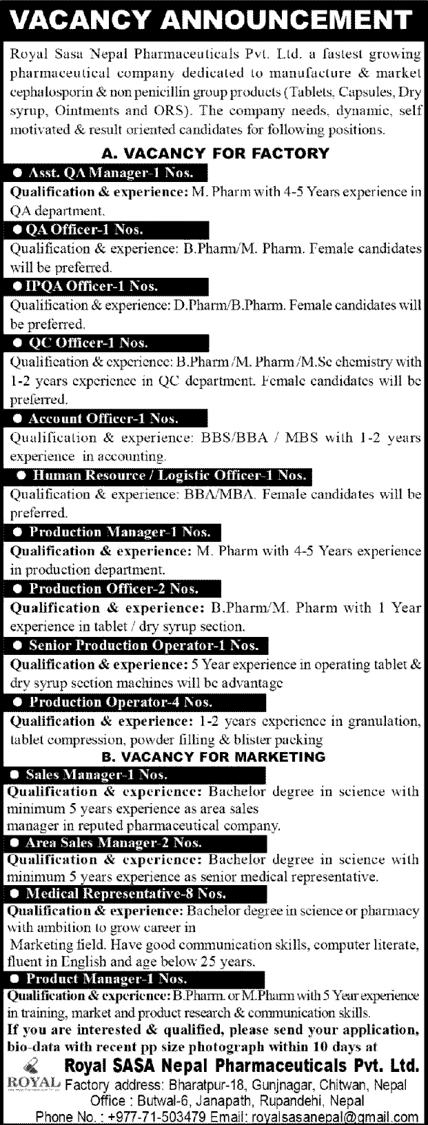 Royal Sasa Nepal Pharmaceuticals Pvt. Ltd. published job vacancy notice in various posts and level. Royal sasa Nepal Pharmaceuticals a fastest growing pharmaceutical company dedicaled to manufacture & market cephalosporin & non penicillin group products (Tablets. Capsules, Dry syrup, Ointments and ORS). The company needs, dynamic, self motivated & result oriented candidates for the following positions.