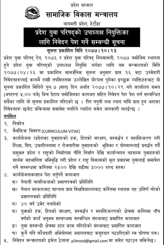 Ministry of Social development Pradesh Government published a notice regarding the Yuwa Parishad Youth Council Vice president. Information regarding the submission of application for the appointment of the Vice President of the Provincial Youth Council.