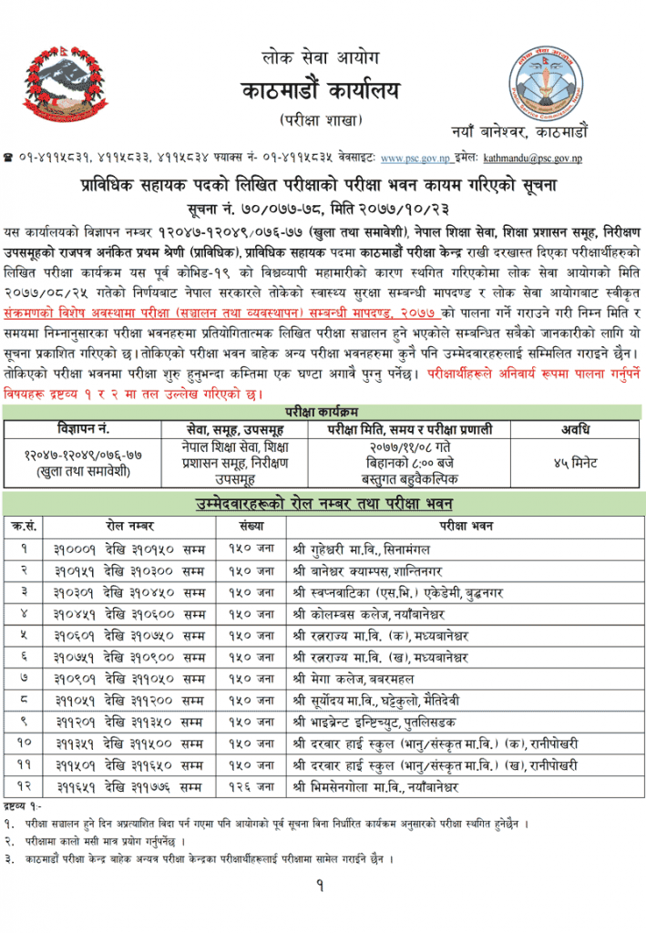 Pra Sa Exam Center Prabidhik Sahayak Exam Center Shiksha sewa, Prabidhik Sahayak & Prabidhik Na Su exam Center recently published by Lok Sewa aayog. Prabidhik Sahayk Pra Sa Exam Center of Kathmandu, Surkhet, Humla, Dolpa, Pokhara, Butwal, Surkhet, Dipayal, Dhankuta are given below. All the Exam Center details of Technical Na Su Pra sa Prabidhik Sahayak including Education Shiksha, Engineering, Survey, Agriculture, Meteorological, Forest botany all service are given below.