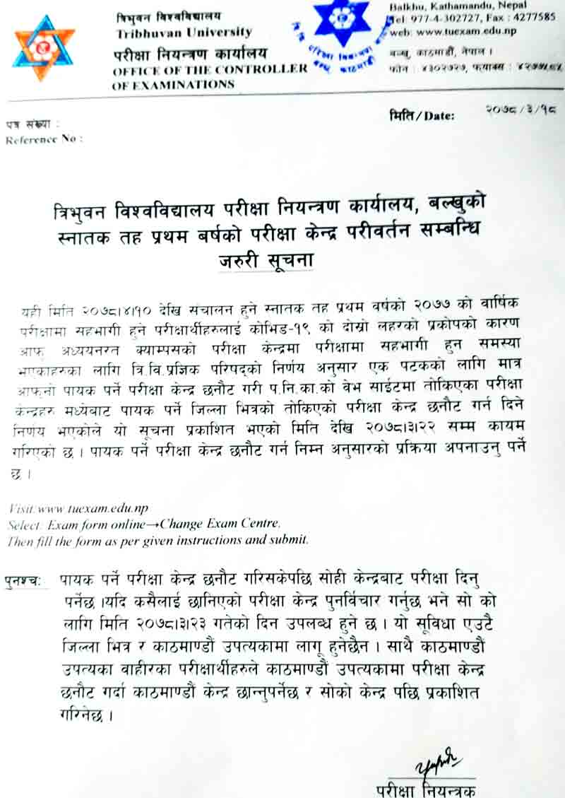 Candidates appearing for the annual examinations of the first year of graduation level 2077, which will be conducted from 2078.4.10, will have to choose the examination center of their choice only once for those who have difficulty in appearing in the examination center of the campus where they are studying due to the outbreak of the second wave of COVID-19.