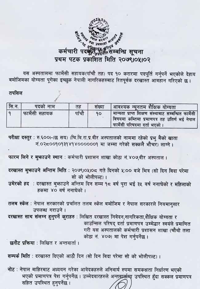 Bir Hospital Kathmandu published a job vacancy notice for various posts and levels. Pharmacy Assitant job vacancy notice application open by Bir Hospital. Bir Hospital has demanded staff/ employees for six months. Bir Hospital Job Vacancy notice details are given below. Bir Hospital is the oldest hospital of Nepal. This hospital was established in 1947 BS, under the name of contemporary Prime Minister Bir Shamsher Jung Bahadur Rana. Initially it was a seven bed hospital with 5 staffs. Today it has a proud history of 125 years and the first hospital of Nepal wherethe practice of modern medicinecommenced.