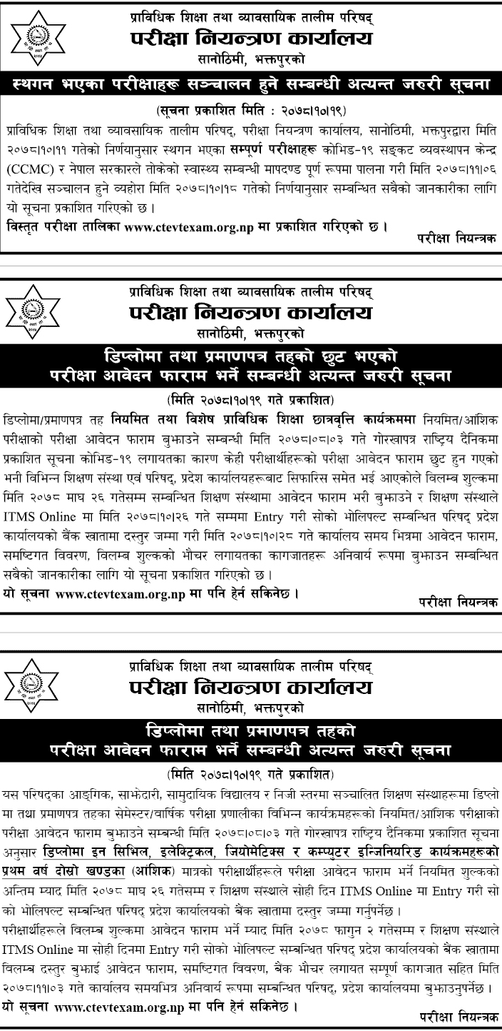 CTEVT Exam conduct, Exam form application fill up notice. CTEVT Exam Controller Office published the notice regarding Exam conduct, Exam Application form fill up notice. The Council for Technical Education and Vocational Training (CTEVT) constituted in 1989 (2045 BS) is a national autonomous apex body of Technical and Vocational Education and Training (TVET) sector committed for the production of technical and skillful human resources required to the nation. It mainly involves in policy formulation, quality control, preparation of competency based curriculum, developing skill standards of various occupations and testing the skills of the people, conduct various research studies and training needs assessment etc