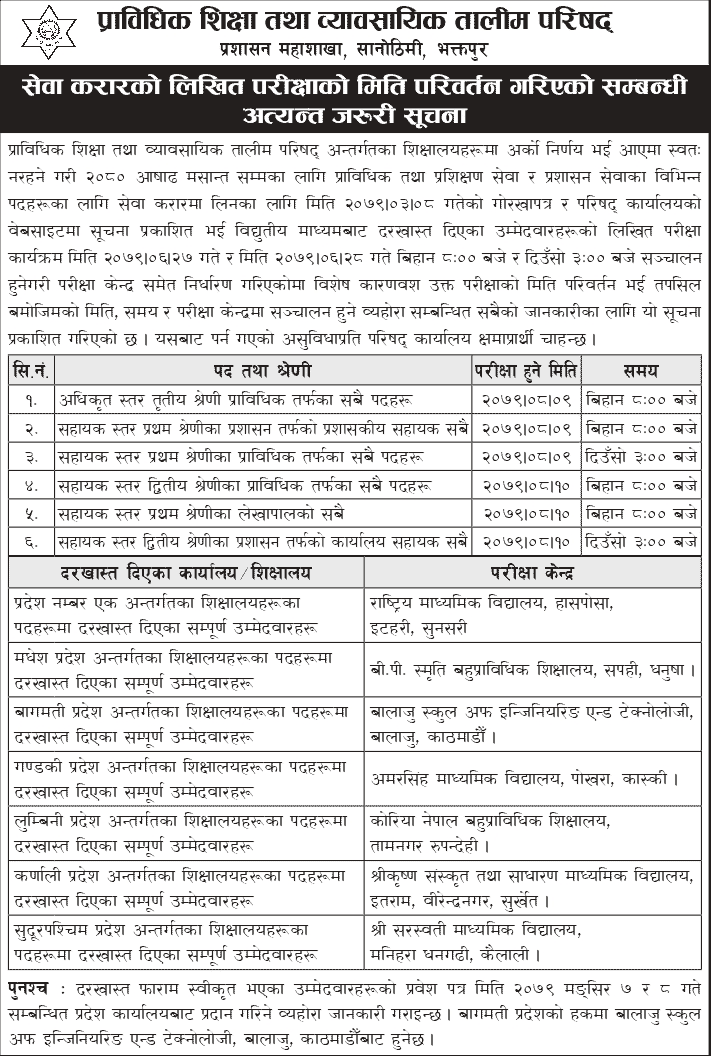 CTEVT published a vacancy notice for various posts and levels of administrative and technical posts. Very important notice regarding the change of date of the written examination of the service contract.