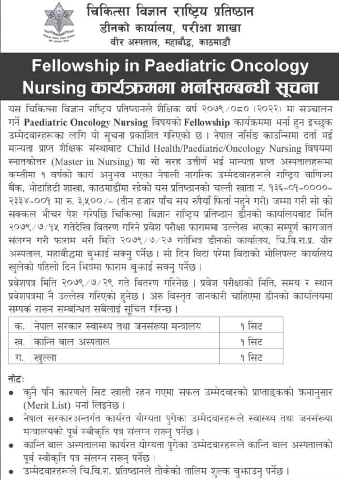 Nepalese citizen candidates who have at least 1 year of work experience in recognized hospitals and who have passed a Master’s degree in Child Health/Pediatric/Oncology Nursing from a recognized educational institution registered with the Nepal Nursing Council or similar must submit the form by attaching the documents.