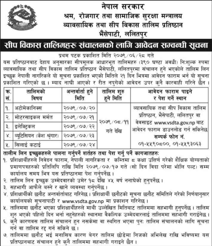 The government of Nepal, the Ministry office & CTEVT Technical will conduct 390 Hours, and 1696 Hours of Technical Skill Training free vocational training in the financial partnership. All the training application details are given below.