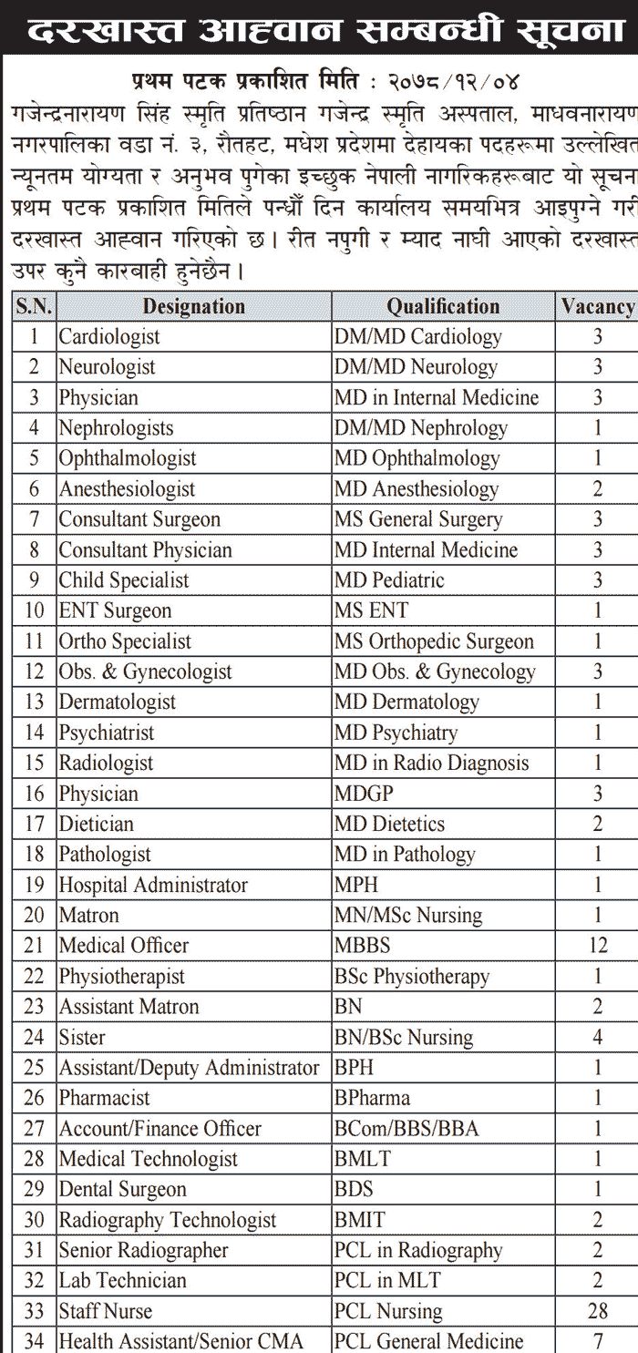 Gajendra Hospital published the job vacancy notice in various posts and levels. Gajendra Narayan Singh Smiriti Pratishthan, Gajendra Smiriti Hospital, Madhabnarayan Municipality Rautahat published the job vacancy in various health services & administration services.