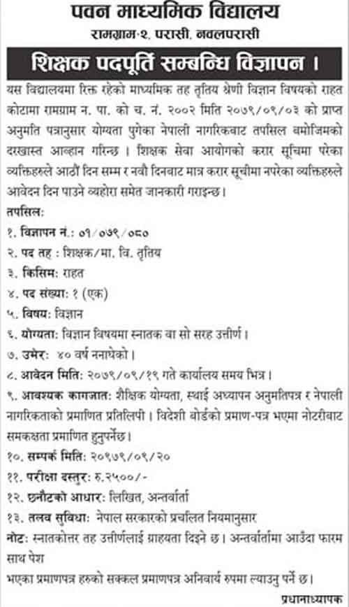 Rahat Teacher Job Vacancy in Nawalparasi Sarkari School Teacher Job