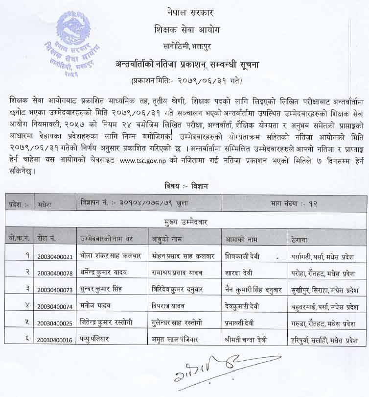 Science Bigyan Result Ma Bi Secondary Level Teacher Result Name Lists