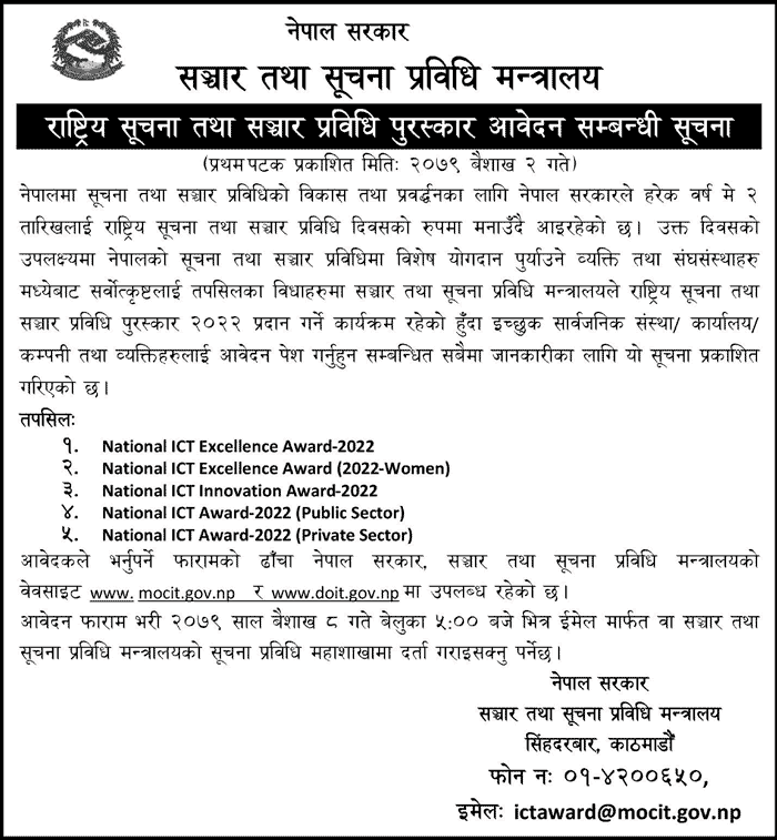 The application form should be registered by 5:00 pm on Baisakh 8, 2079 BS by Email: ictaward@mocit.gov.np or at the Information Technology Division of the Ministry of Communications and Information Technology.