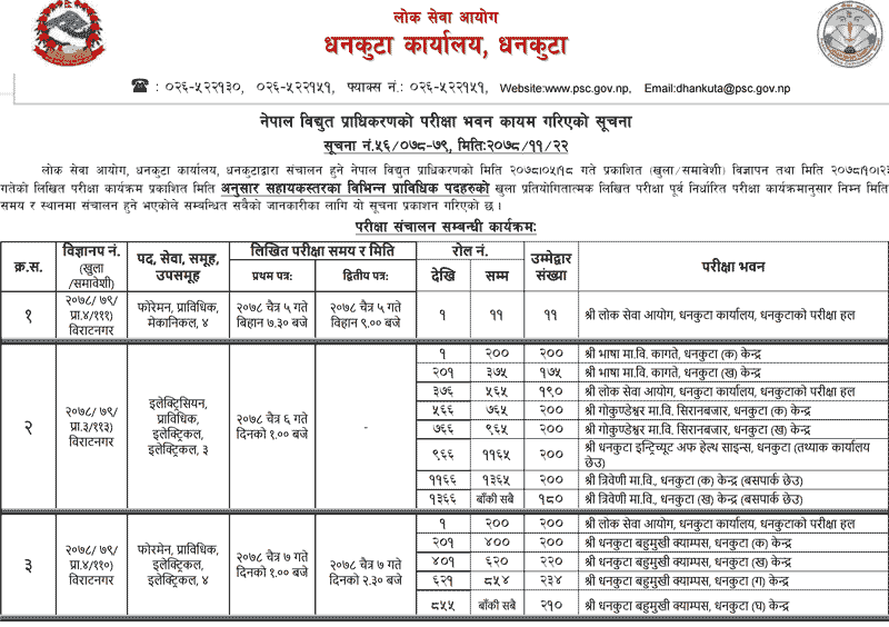 NEA Nepal Electricity Authority Nepal Bidyut Pradhikaran various vacancy posts written exam center details published by Lok Sewa Aayog. All the exam center details of Nepal Bidyut Pradhikaran are given below. Butwal, Dang, Dhankuta, Kanchanpur, Kathmandu, Surkhet NEA Nepal Bidyut Exam center details published by Lok Sewa Aayog.