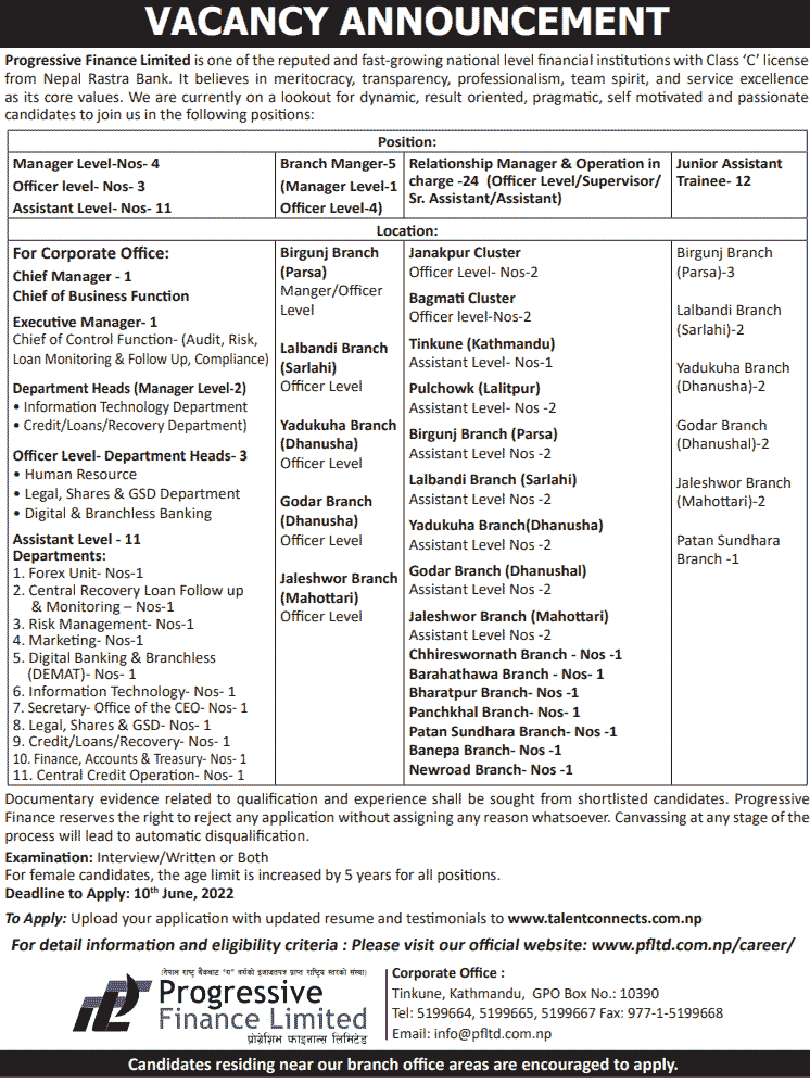Progressive Finance Limited published a job vacancy notice in various post and levels. VACANCY ANNOUNCEMENT Progressive Finance Limited is one of the reputed and fast-growing national level financial institutions with Class ‘C’ license from Nepal Rastra Bank. It believes in meritocracy, transparency, professionalism, team spirit, and service excellence as its core values. We are currently on a lookout for dynamic, result oriented, pragmatic, self-motivated and passionate candidates to join us in the following positions: