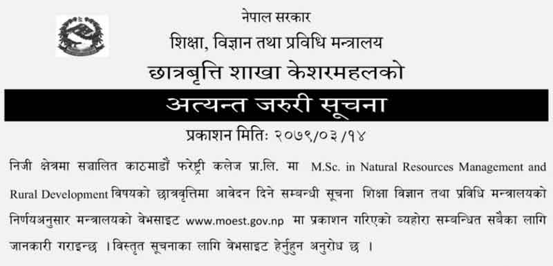 Scholarship Application open by the Government of Nepal Ministry of Education MOEST. For Various levels of Bachelor’s & Masters level scholarship applications open by the Government of Nepal MOEST. M.Sc. in Kathmandu Forestry College affiliated to Tribhuvan University. Urgent Information on Application Demand for Scholarship in Natural Resources Management and Rural Development