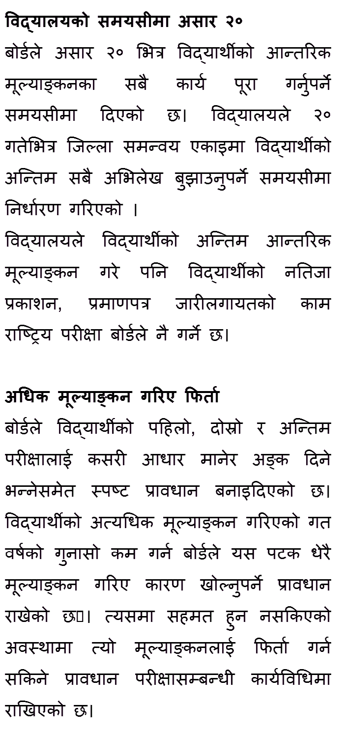 The board has given a deadline of Ashadh 20 to complete all the internal assessment of the students. The school is scheduled to submit all the final records of the student to the district coordination unit within 20 days.