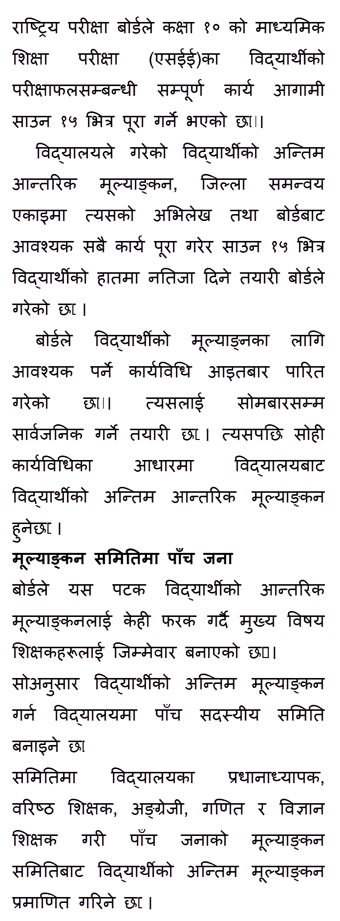 The National Examination Board (NEB) has decided to complete all the work related to the results of the Secondary Education Examination (SEE) of class 10 by Shrawan 15. The board is preparing to give the results in the hands of the students by Shrawan 15 after completing the final internal assessment of the students by the school, its records in the district coordination unit and all the necessary work from the board.