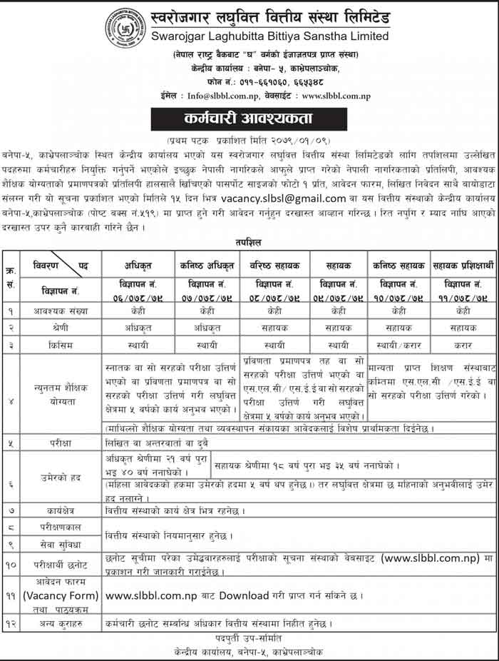 How To Apply: Go to www.slbbl.com.np & download the Application form & Send to email: vacancy.slbsl@gmail.com
