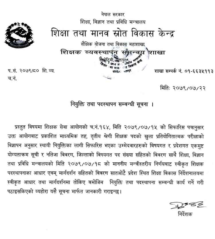 CEHRD Education Center published the notice regarding Teacher Appointments & Teacher Posting. Center for Education and Human Resource Development, Educational Planning and Development Division, Teacher Management Coordination Branch notice regarding appointment and posting of teachers, which is selected by the Teacher Service Commission TSC Exam.