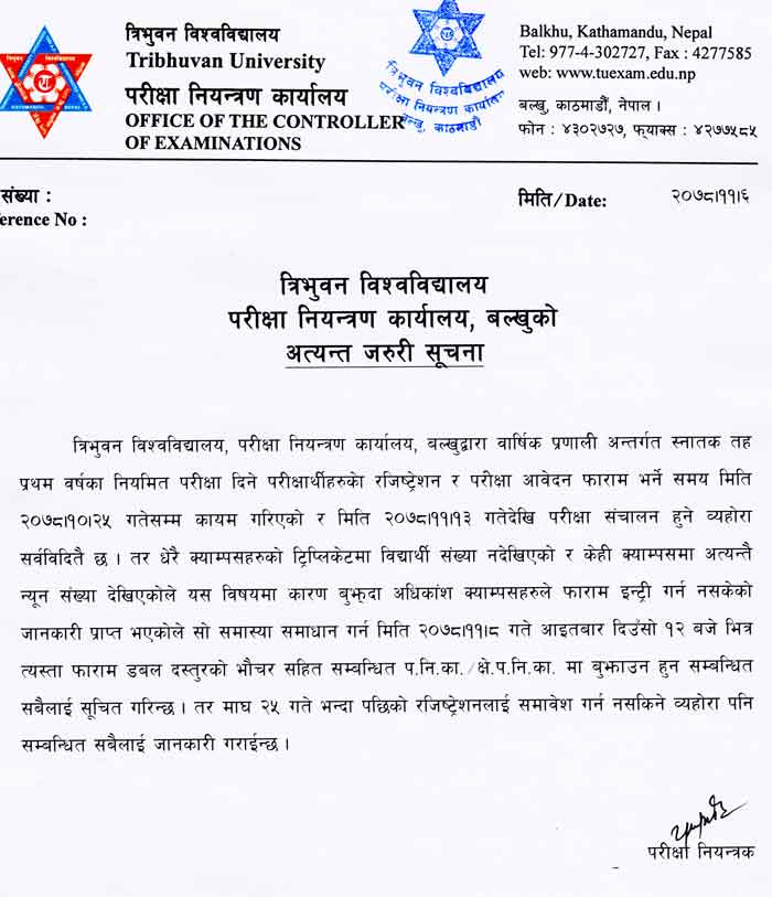 TU Bachelor Level First year Exam Form Registration Application & Triplicate Notice