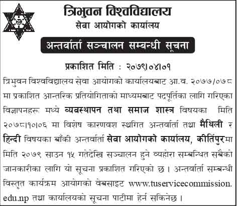 Tribhuwan University Service Commission ( TU Sewa Aayog) published important notice regarding the interview program for the post of professor and associate professor of various subjects. For the recommendation of appointment of teachers on the basis of investigative specificity was postponed till further notice due to special reasons. The postpone TU Sewa aayog interview program will be conducted from give date and time.
